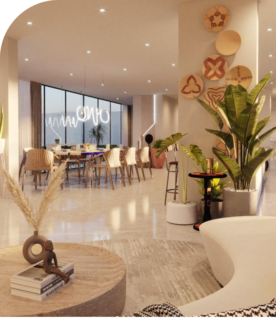 A private loungestyle cinema allows residents to unwind in comfort and style.The space fuses strong ethnic designs and flexible seating arrangements, to create a relaxing space to enjoy.