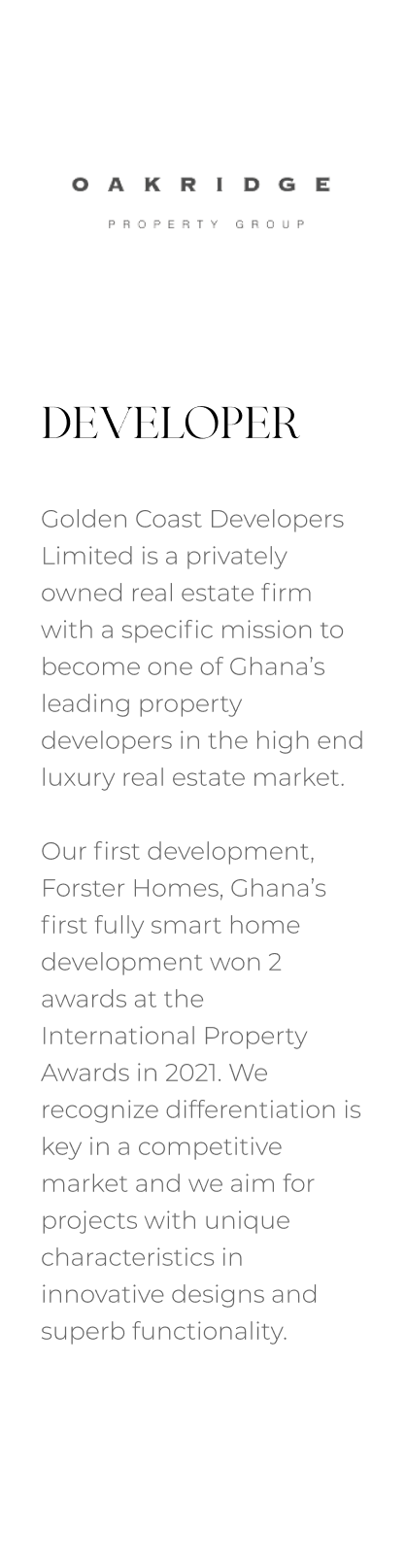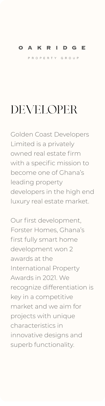 specific mission to become one of Ghana’s leading property developers in the high end luxury real estate market. Our first development, Forster Homes, Ghana’s first fully smart home development won 2 awards at the International Property Awards in 2021. We recognize differentiation is key in a competitive market and we aim for projects with unique